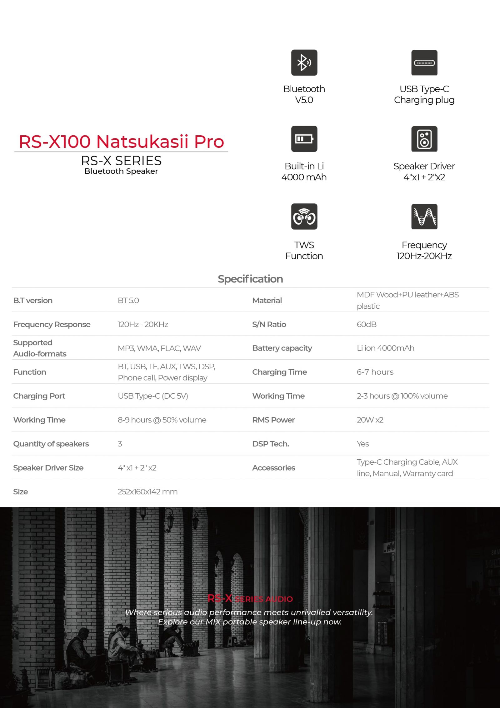 BT, USB, TF, AUX, TWS, DSP, Phone call, Power display
