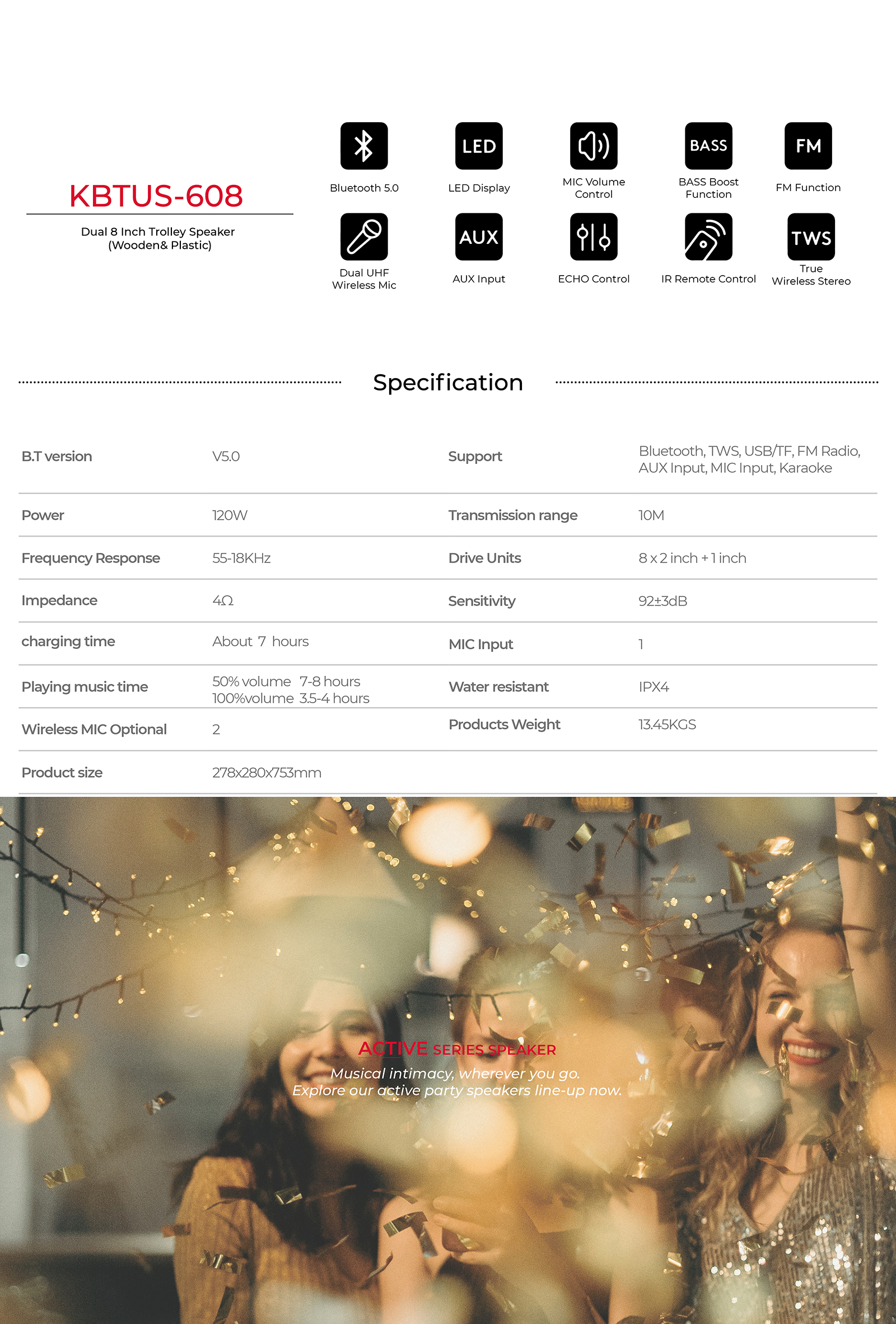 Bluetooth, TWS, USB/TF, FM Radio, AUX Input, MIC Input, Karaoke