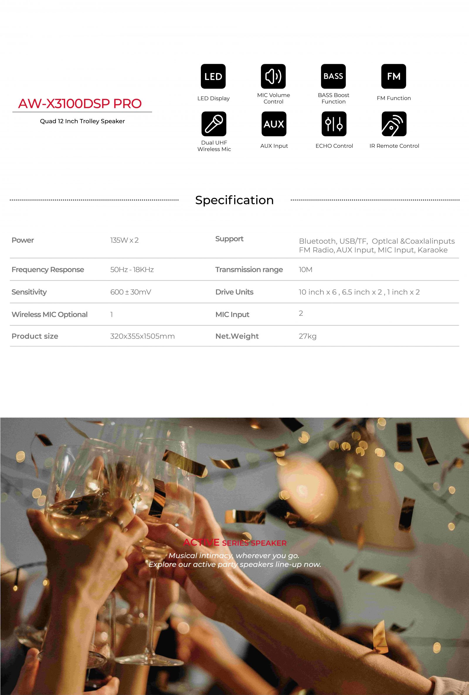 Bluetooth, TWS, USB/TF, FM Radio, Optlcal &Coaxlalinputs, AUX Input, MIC Input, Karaoke